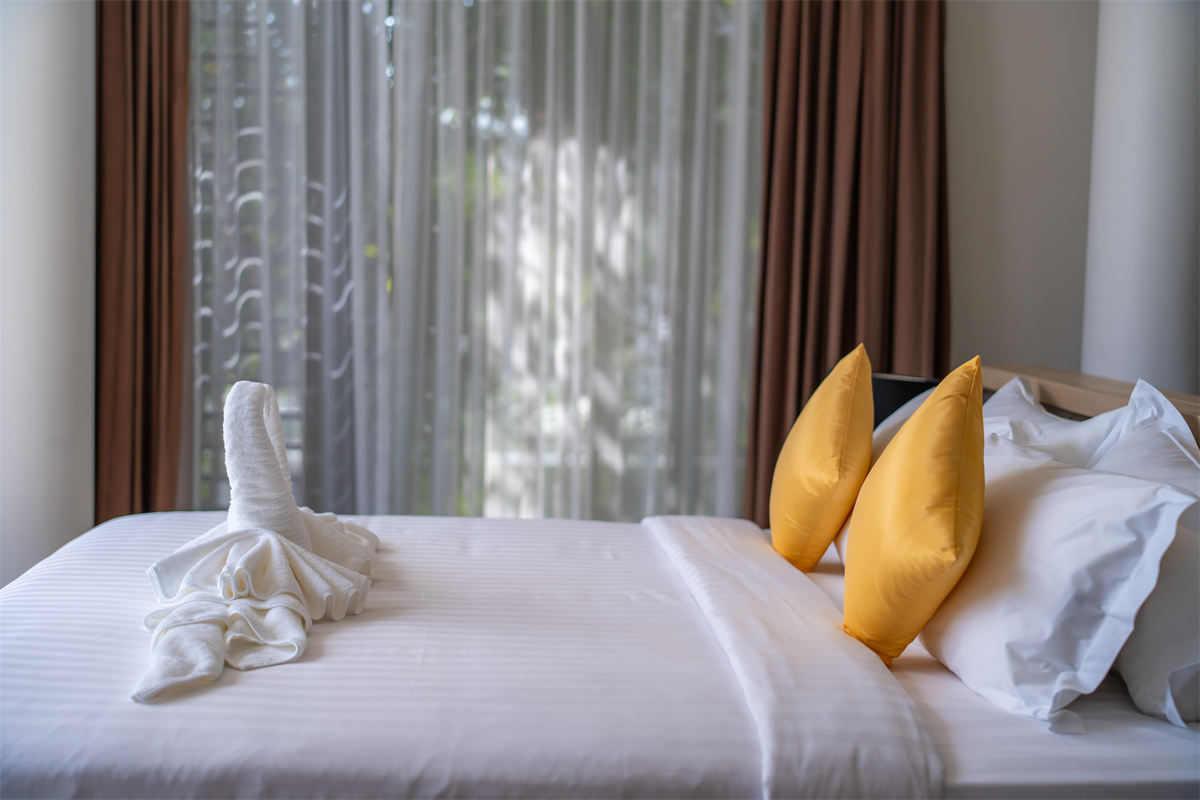 Bedroom The brown-wood style home furnishings make the whole room simple and solemn. A double bed faces the pool and the sea. GALLERY