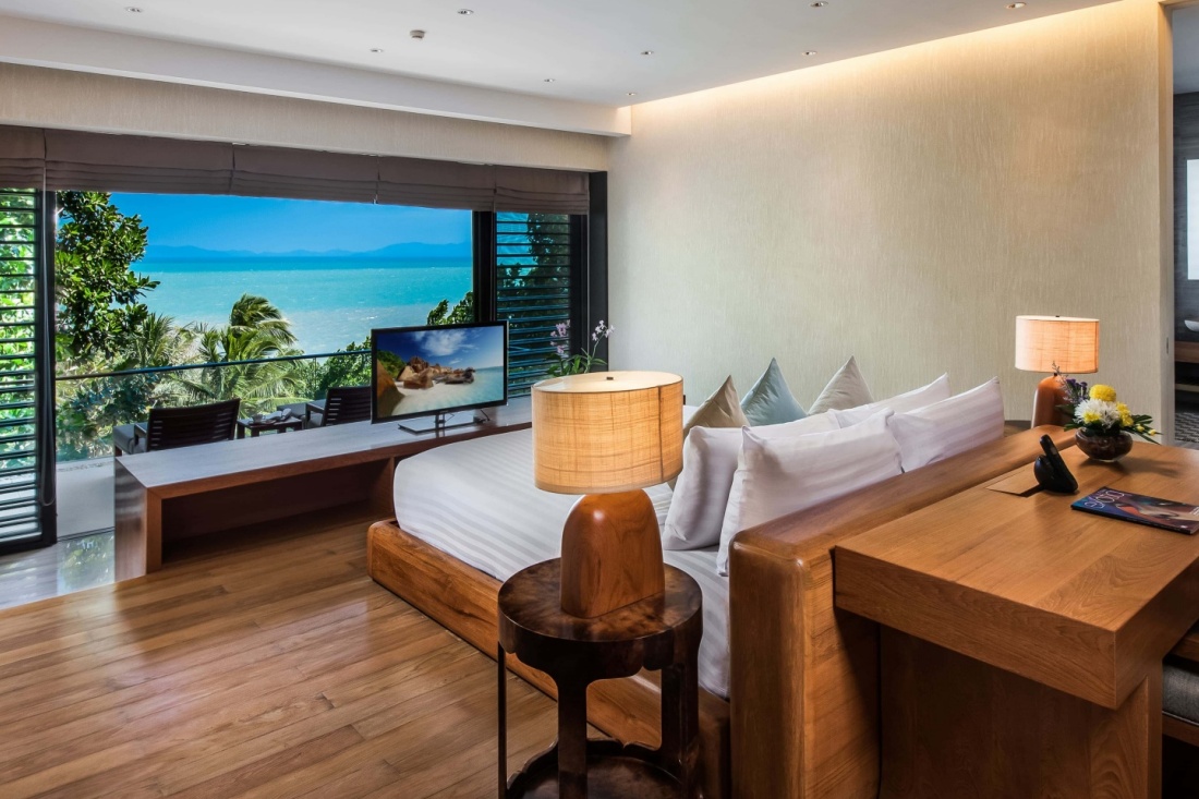 Each bedroom has a sea view,with views taking in glorious Phang Nga Bay, the spectacular sun rises to light up,the grand atrium living space. The sun’s rays flood in through the wide-open,cathedral-like front that frames the villa infinity pool and sparkling sea view on the horizon magnificently.Work desk; wardrobe; 42-inch flat-screen satellite TV; safe; air conditioning; ensuite bathroom with shower and shower, vanity and separate toilet
